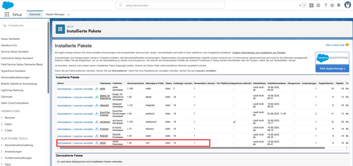 Nach Abschluss der Installation empfehlen wir, die Installation im Abschnitt „Pakete“ unter „Installierte Pakete“ in der Salesforce-Einrichtung zu überprüfen.