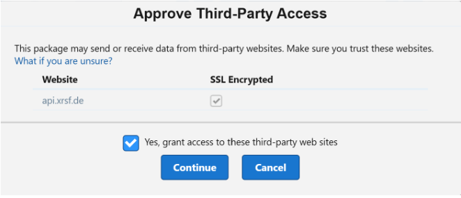 Hintergrund: Im Rahmen der Installation muss die Freigabe erteilt werden, verschiedene Schnittstellen anzusprechen. Neben der Schnittstelle muss auch die Kommunikation mit den Servern von XRSF für den reibungslosen Betrieb des Tools hergestellt werden.