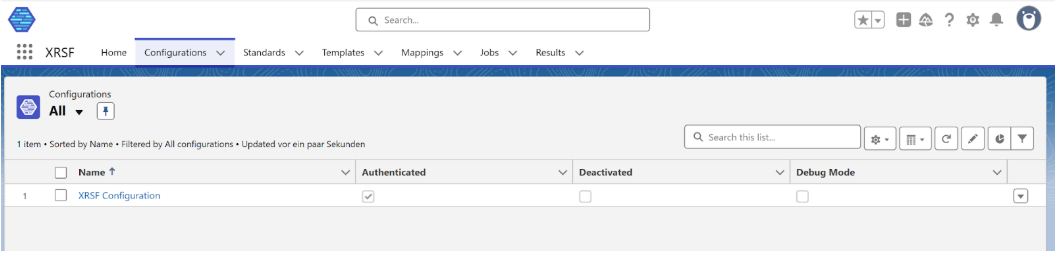Wechsel in der App direkt in den „Configurations“-Reiter. Hier findest du bereits einen Konfigurations-Datensatz vor. In diesem Datensatz musst du Felder mit den notwendigen Informationen befüllen, um XRSF zu konfigurieren.