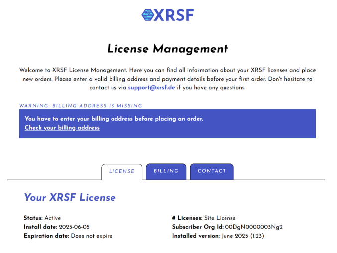 In der XRSF-App findest du auf Ebene des Konfigurations-Datensatzes den Button "Manage Licenses". Klickst du auf den Button, öffnet sich eine Login-Seite zu deinem License-Management-Bereich. In diesem Kundenportal findest du alle wichtigen Daten zu deinen XRSF-Lizenzen, Zahlungsinformationen, aber auch die Möglichkeit, per Klick weitere Lizenzen hinzuzubuchen.