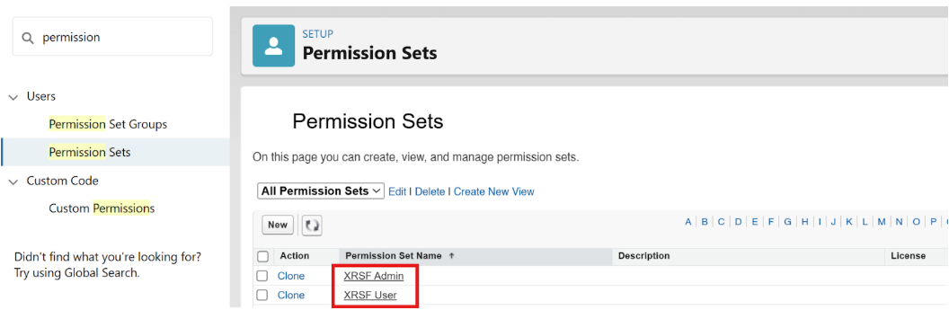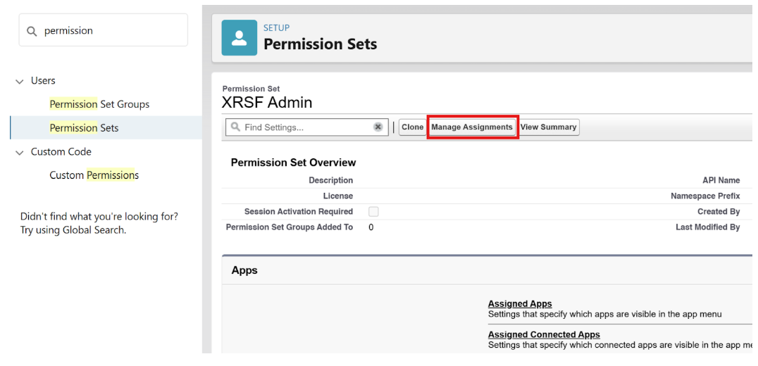 Die Zuweisung von Salesforce-Berechtigungssets erfolgt hingegen separat. Grundsätzlich werden in XRSF die folgenden Typen von Salesforce-Berechtigungssätzen unterschieden:
