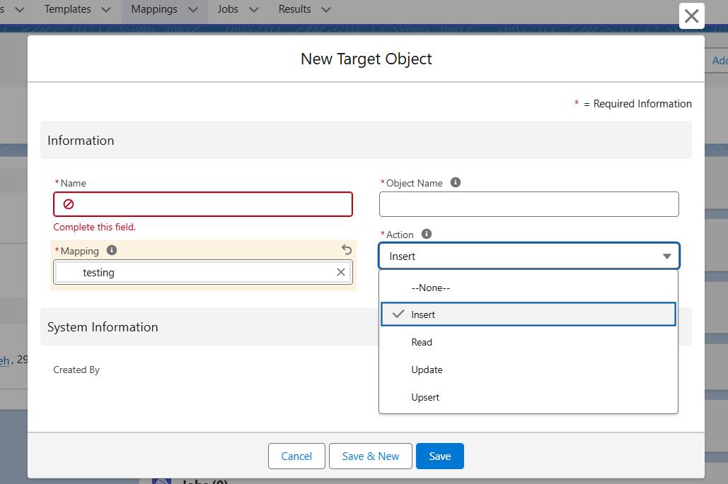 Nun öffnet sich eine Oberfläche zur Erstellung eines Target Objects. Hier kannst du Namen des Target Objects, den API-Namen des gewünschten Objekts, und das zugehörige Mapping angeben. Außerdem kannst du wählen, welche Operation für dieses Objekt ausgeführt werden soll. Dafür gibt es vier Möglichkeiten: