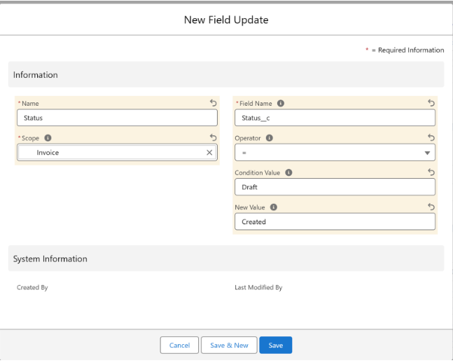 Einen kleinen Unterschied gibt es allerdings bei Field Updates: Da für Field Updates bereits eine Scope definiert ist, in welcher Veränderungen vorgenommen werden sollen, reicht hier nur der API-Name des Feldes als Referenz auf das Feld (statt {!ScopeName.FieldName} reicht hier nun {!FieldName} ).