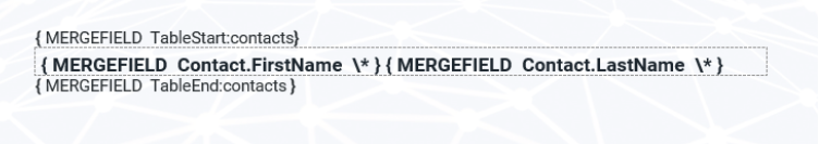 wobei ScopeName den API-Namen der jeweiligen Scope und FieldName den API-Namen des jeweiligen Felds darstellt. Der Zusatz MERGEFIELD ist außerdem verpflichtend, MERGEFORMAT ist optional und dient als Platzhalter für Formatspezifikationen (etwa bei Datum/Uhrzeit oder Groß- und Kleinschreibung). Mergefelder in Microsoft Word müssen mit dem Shortcut STRG + F9 eingefügt werden.