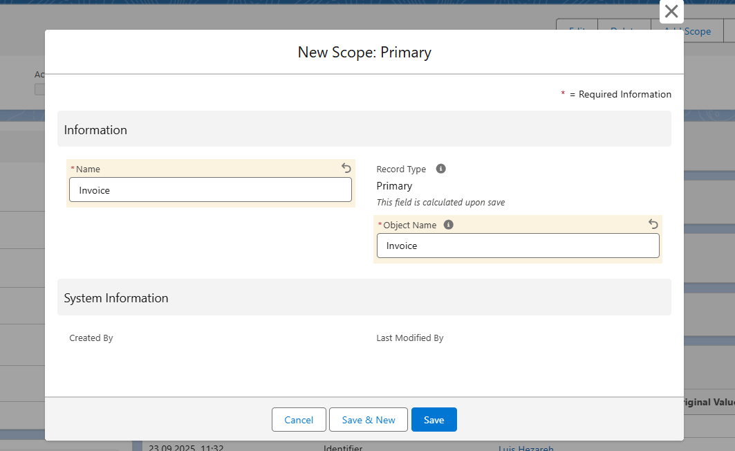 Target Objects können zusätzlich zu den Scopes angelegt werden. Diese sind speziell für die Verarbeitung eingehender Rechnungen konzipiert und dienen dazu, spezifische Aktionen auf Salesforce-Objekten durchzuführen. Um ein neues Target Object zu erstellen, klicke auf 'New' im Bereich "Target Objects".