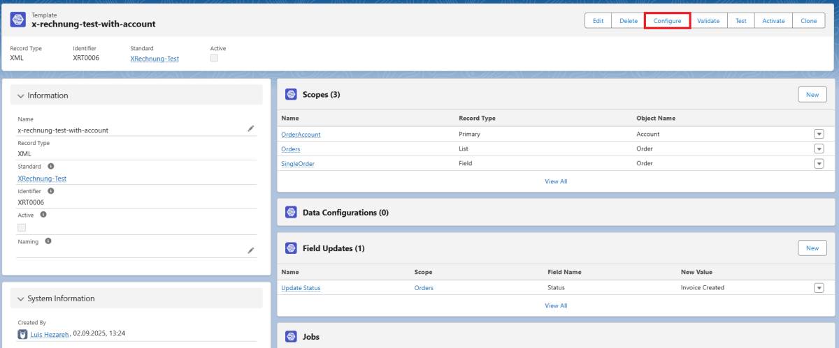 Templates | Define how each XML and PDF element is populated using Salesforce data, static values or nested configurations. |